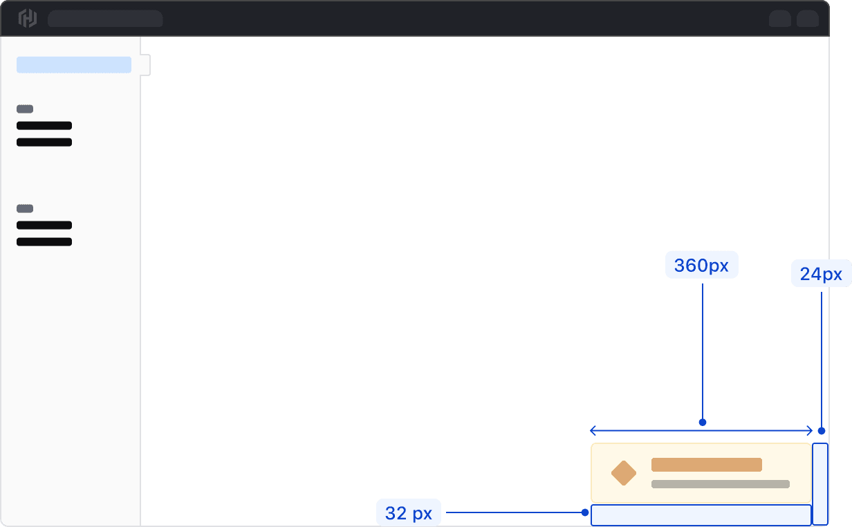 Toasts appear in the bottom right corner of the viewport with a margin of 32px from the bottom and 24px from the right side of the viewport. If a warning or error is contextual to a specific UI feature, such as a form, directly associate an Alert to that feature instead of using a Toast.